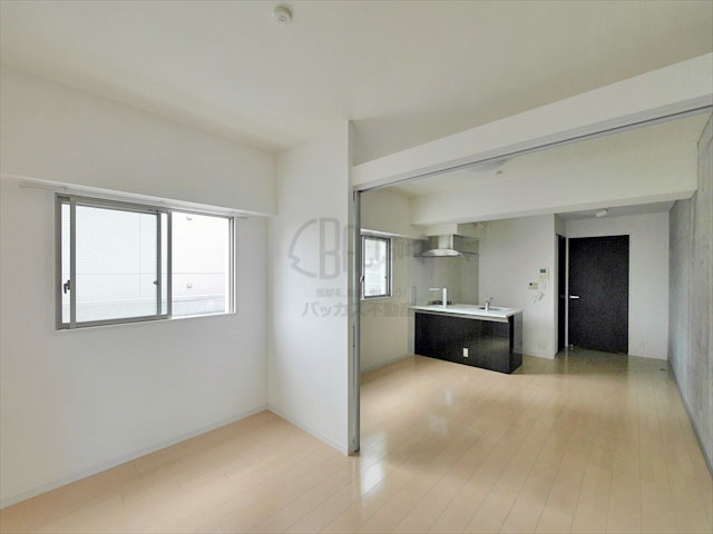 洋室側からキッチンを見た光景です。オープンタイプのキッチンなので、お友達が遊びに来ても会話を楽しみながらお料理ができます。