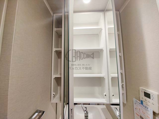 三面鏡の後ろが収納スペースとなっており、毎日使うスキンケアグッズなどもスッキリ収納できます。