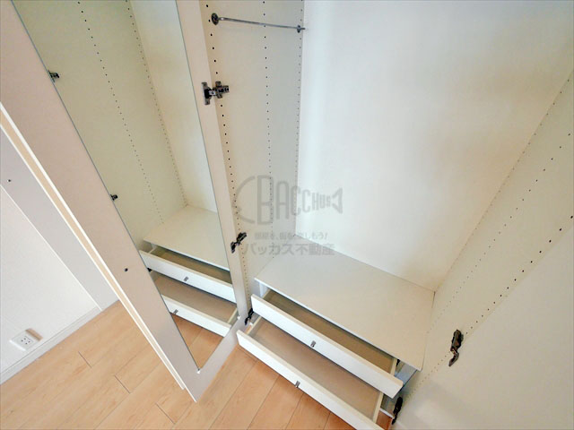 扉の裏には全身鏡もついているので、ファッションチェックができます。靴下や下着などを入れやすい引き出しもあります。