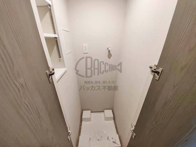 洗濯機置き場の奥に収納棚があり、ランドリー用品などを置いておけます。