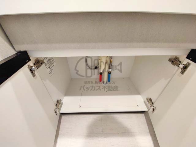 上部には中のものが見えない扉付きの棚、トイレットペーパーなどのストック用品を収納できます。