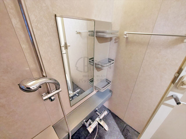 シャワーの高さが変えられて便利な他、シャンプーやボディソープなどを置いておける棚が3つあります。