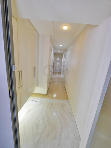 玄関はとても広く、床は大理石調。左側シューズボックス下からの間接照明が優しい
