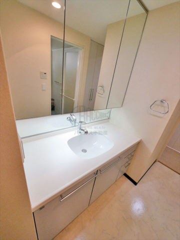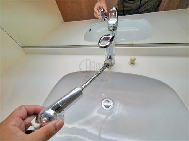 洗面台は全面鏡になっています。蛇口の裏側の鏡が洗面台をより一層大きく見せて