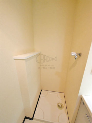 洗濯機置き場です。左側にちょっとしたものを置けるスペースがあるのも便利