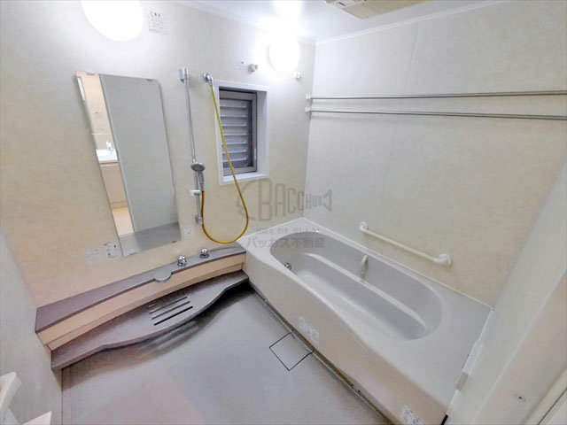 薄ピンクに薄グレーの色合いの浴室は落着き感を与えます。バスタブには手すりもついたバリアフリーとなっています。