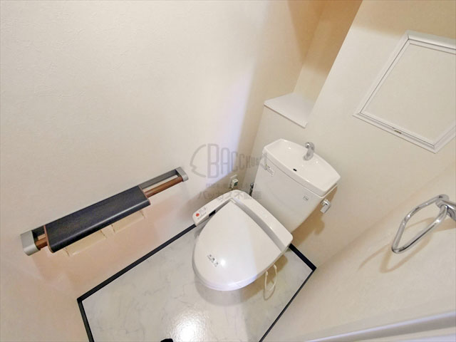 トイレはウオシュレット付き、ペーパーホルダーがとてもおしゃれです。