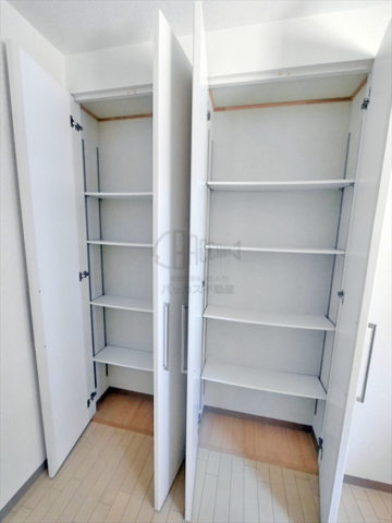 同タイプの収納が2つ隣り合っています。棚の高さを変えて大きなものも収納できる万能型です。