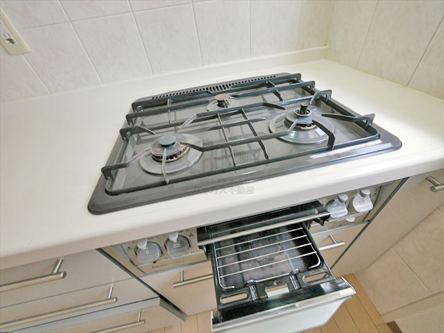 ガスコンロ3口と、お魚用グリルがついています。