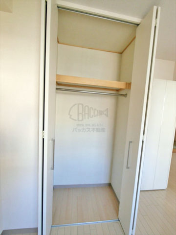 クローゼットがついていて、洋服がけの他、上の棚にも収納ができるようになっています。